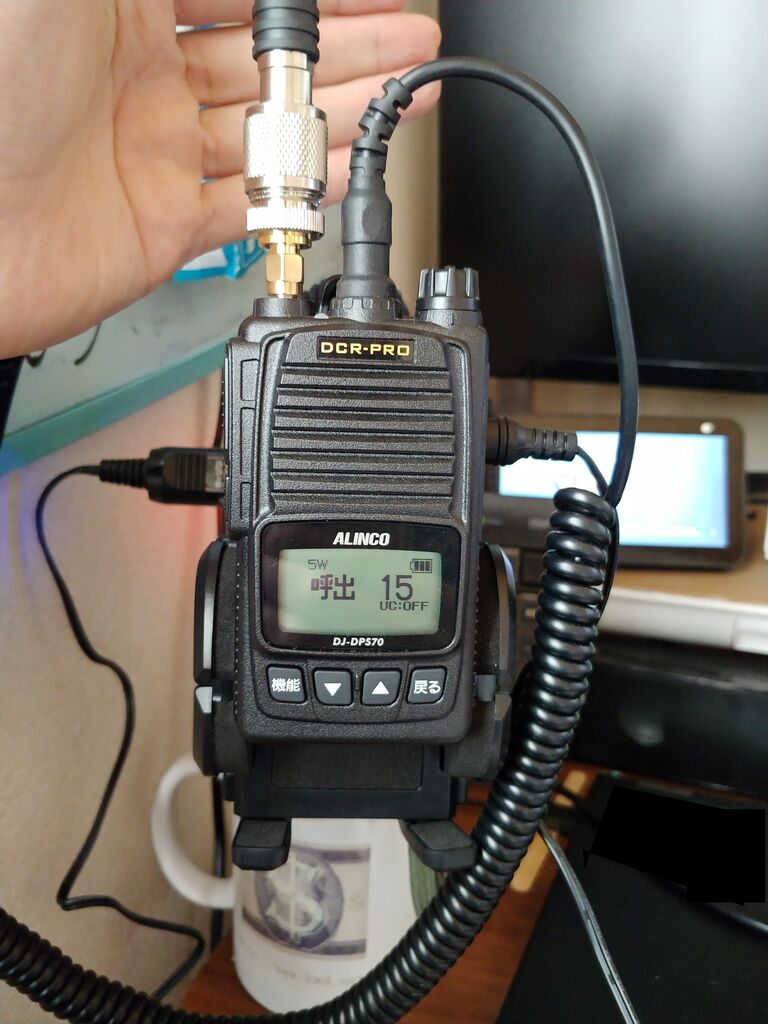 なので、安定化電源から、CUP-200に接続して、そこのシガーソケットから、DJ-DPS70のDCアダプターにつけるという荒業使いました。